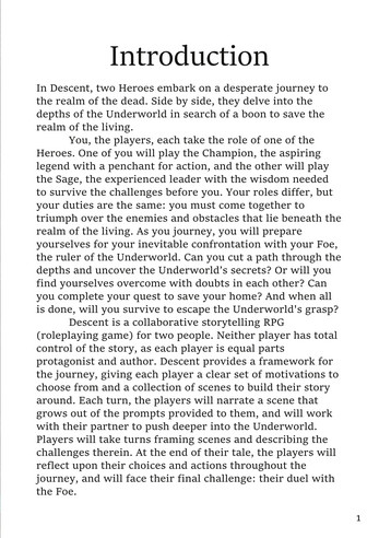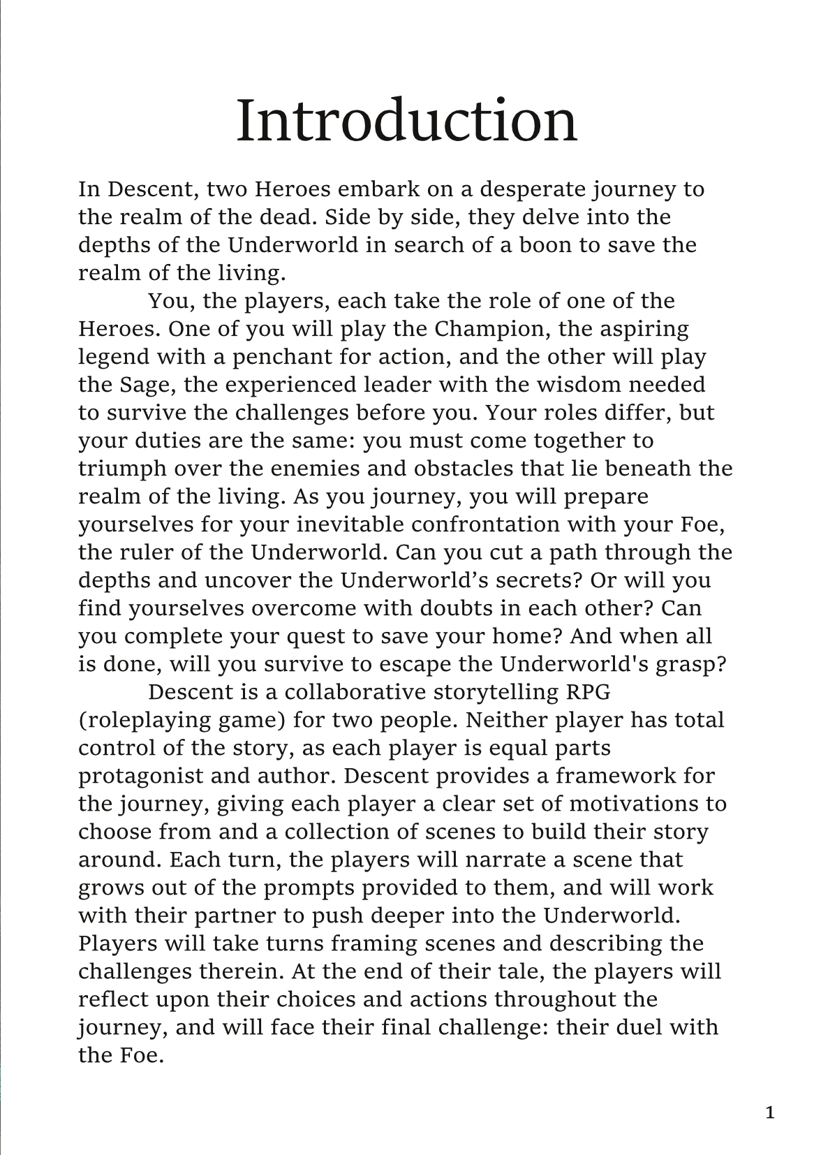 Descent is a short (42-page), GM-less TRRPG for two people. Neither player has total control of the story, as each player is equal parts protagonist and author. Descent provides a framework for the journey, giving each player a clear set of motivations to choose from and a collection of scenes to build their story around. Each turn, the players will narrate a scene that grows out of the prompts provided to them, and will work with their partner to push deeper into the Underworld. Players will take turns framing scenes and describing the challenges therein. At the end of their tale, the players will reflect upon their choices and actions throughout the journey, and will face their final challenge: their duel with the Foe. It is designed to be played in one long session (3-4 hours) or two short sessions (~2 hours each). It can also be incorporated into campaigns in other systems when the story needs to focus on a dramatic journey undertaken by just two characters.